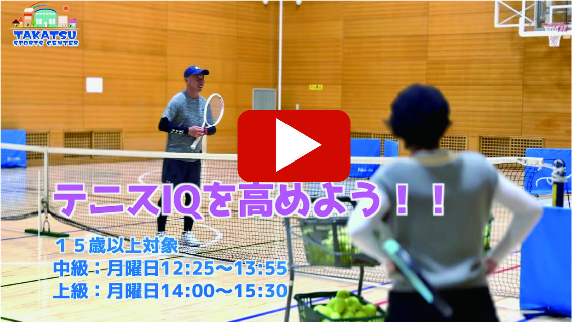 | 時間 | 《Enjoyテニスライフ》(※保育有り) ・初心者・初級 9:15~10:45 ・初中級 10:50~12:20 《テニスIQを高めよう‼》(※保育無し) ・中級 12:25~13:55 ・上級 14:00~15:30 |